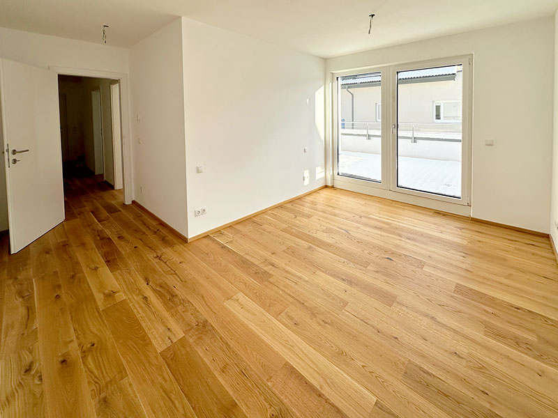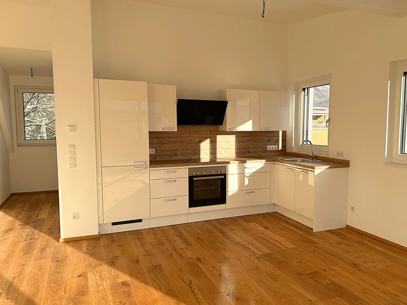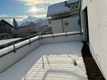Die 3-Zimmer-Wohnung erstreckt sich über den ersten Stock und das Dachgeschoss und ist freundlich und hell gestaltet. Die Ausrichtung nach Südwesten ermöglicht einen herrlichen Blick und lädt dazu ein, die Seele baumeln zu lassen. Besonders hervorzuheben sind die großzügigen und sonnigen Terrasse in jedem Stockwerk mit Blick in die umliegende Bergwelt, zum Untersberg und zur Festung Hohensalzburg. Ein atemberaubendes Panorama begeistert Tag für Tag aufs Neue!