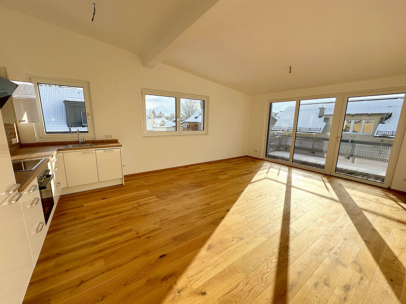 Der Wohn-/ Ess-/ Kochbereich im Dachgeschoss ist ein wahrer Traum für jeden, der sich nach einem großzügigen und lichtdurchfluteten Raum sehnt.